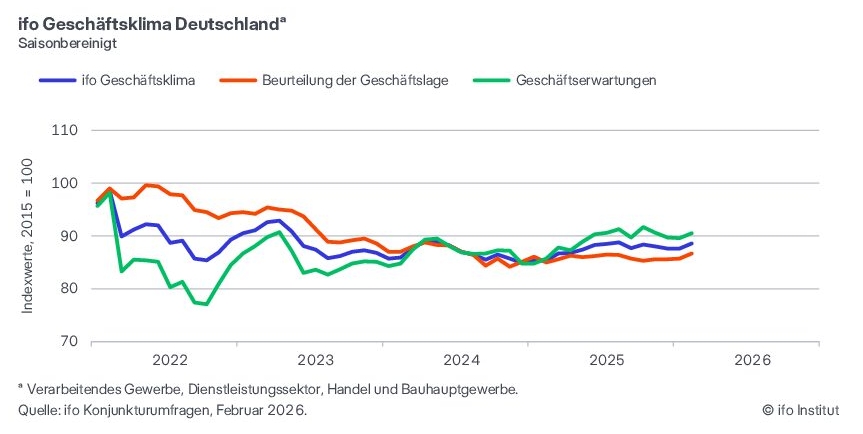 Die Stimmung unter den Unternehmen in Deutschland hat sich verbessert. Der ifo Geschäftsklimaindex stieg im Februar auf 88,6 Punkte, nach 87,6 im Januar. Die Unternehmen zeigten sich zufriedener mit ihren laufenden Geschäften. Auch die Erwartungen hellten sich auf. Die deutsche Wirtschaft zeigt erste Signale einer Belebung.Im Verarbeitenden Gewerbe ist der Index erneut gestiegen. Dies war auf merklich bessere Urteile zur aktuellen Geschäftslage zurückzuführen. Die Erwartungen trübten sich zwar ein, aber die Auftragslage entwickelte sich positiv, und die Produktionspläne wurden nach oben korrigiert.