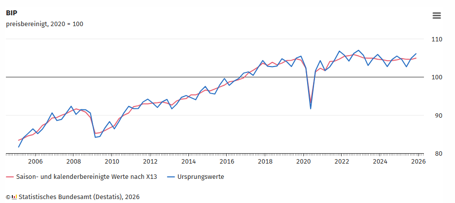 Das Bruttoinlandsprodukt (BIP) ist im 4. Quartal 2025 gegenüber dem 3. Quartal 2025 – preis-, saison- und kalenderbereinigt – um 0,3 % gestiegen. Vor allem die privaten und die staatlichen Konsumausgaben nahmen zu.Damit beendete die deutsche Wirtschaft das insbesondere für den Außenhandel turbulente Jahr 2025 im Plus. Wie das Statistische Bundesamt (Destatis) weiter mitteilte, stieg das preisbereinigte BIP im Jahr 2025 insgesamt um 0,2 %, preis- und kalenderbereinigt betrug der Anstieg 0,3 %.